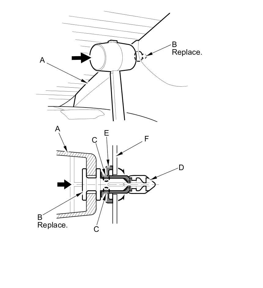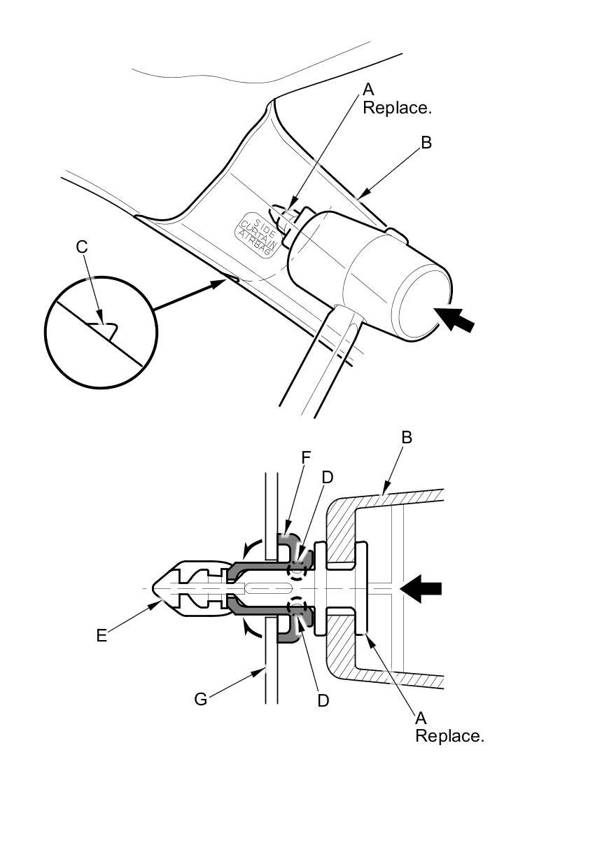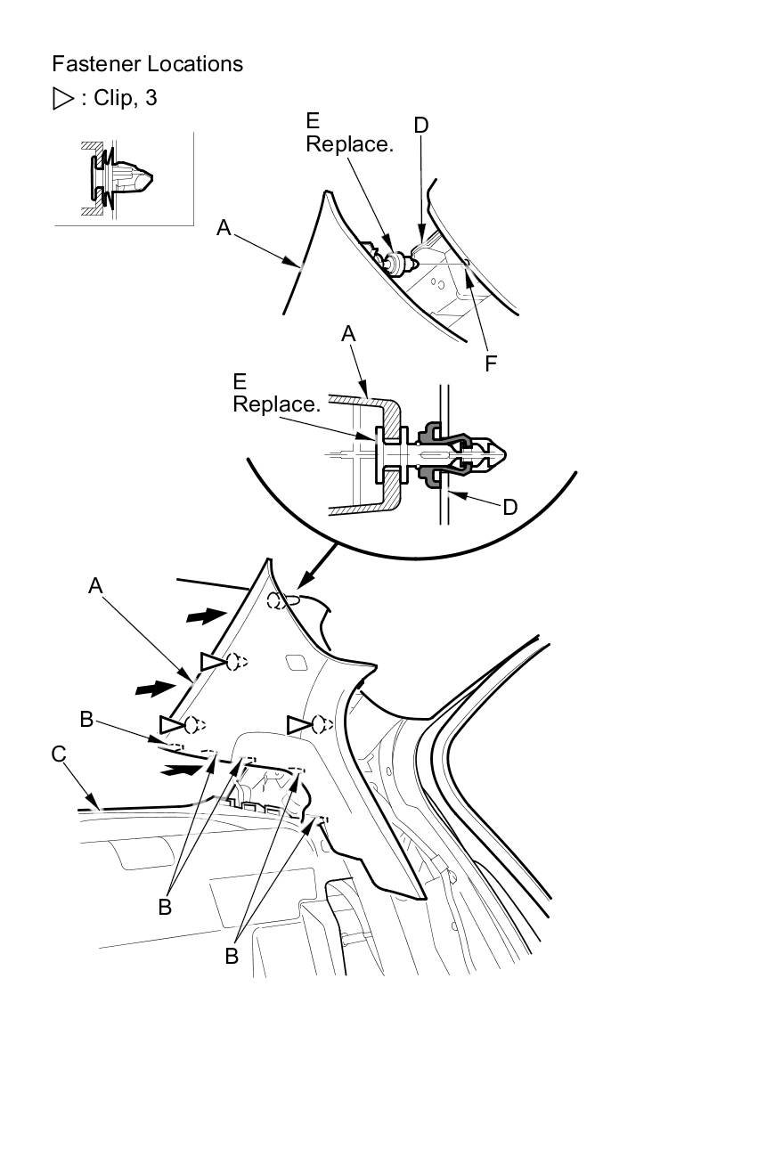 - The upper clip (A) in the C-pillar trim (B) consists of a plastic grommet (C) and a metal pin (D). The grommet expanded by the pin secures it to the body panel (E). The projections (F) on the pin break during removal, so the upper clip must be replaced with a new one when the trim is reinstalled.
