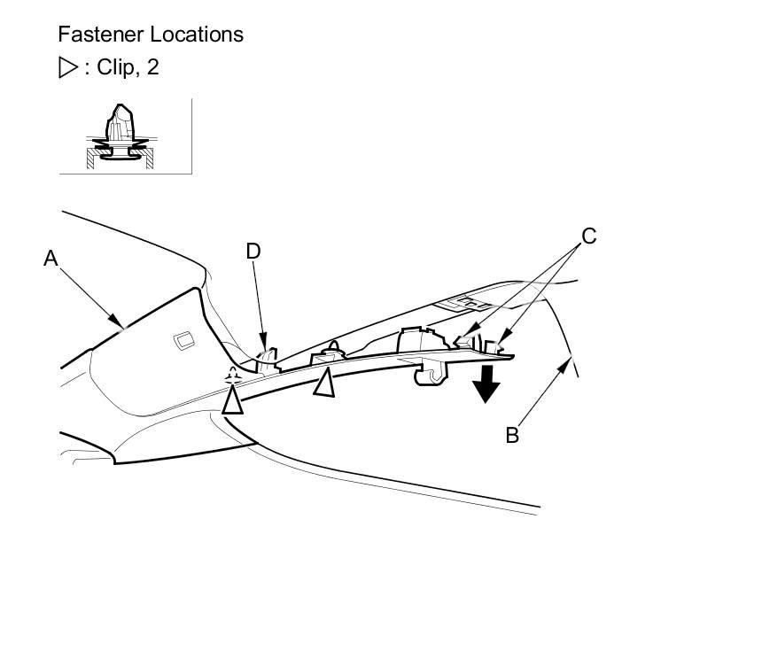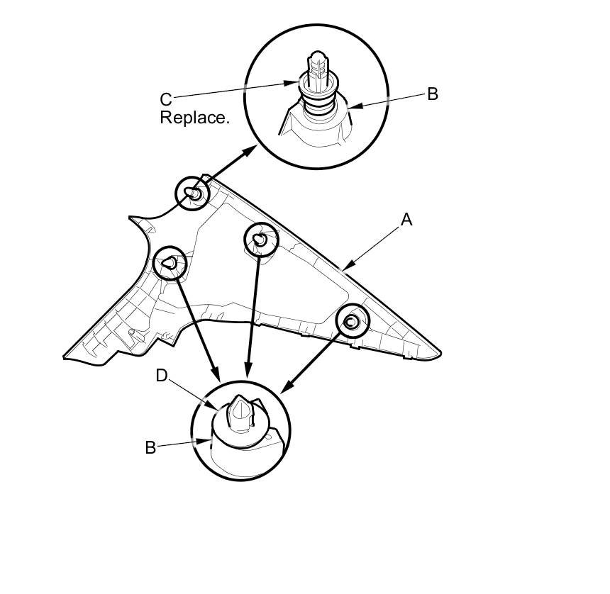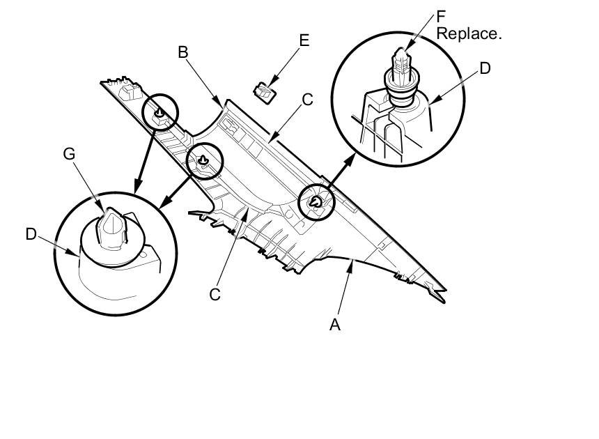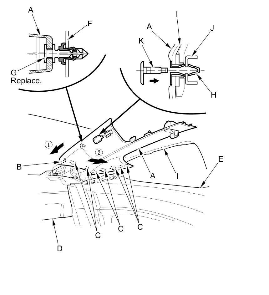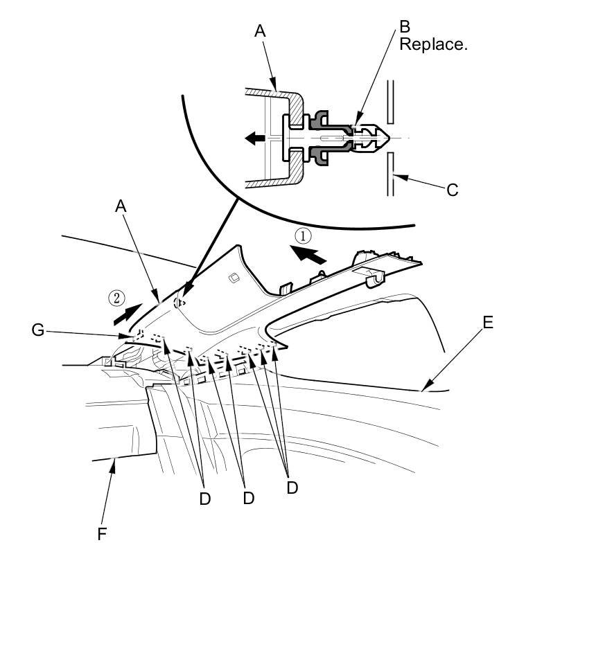 - The upper clip (A) in the C-pillar trim (B) consists of a plastic grommet (C) and a metal pin (D). The grommet expanded by the pin secures it to the body panel (E). The projections (F) on the pin break during removal, so the upper clip must be replaced with a new one when the trim is reinstalled.