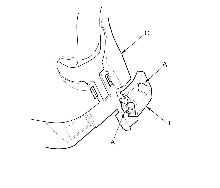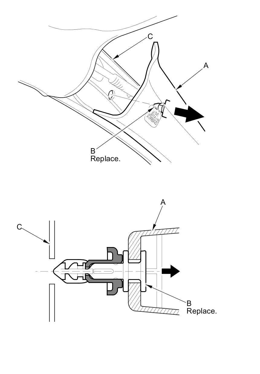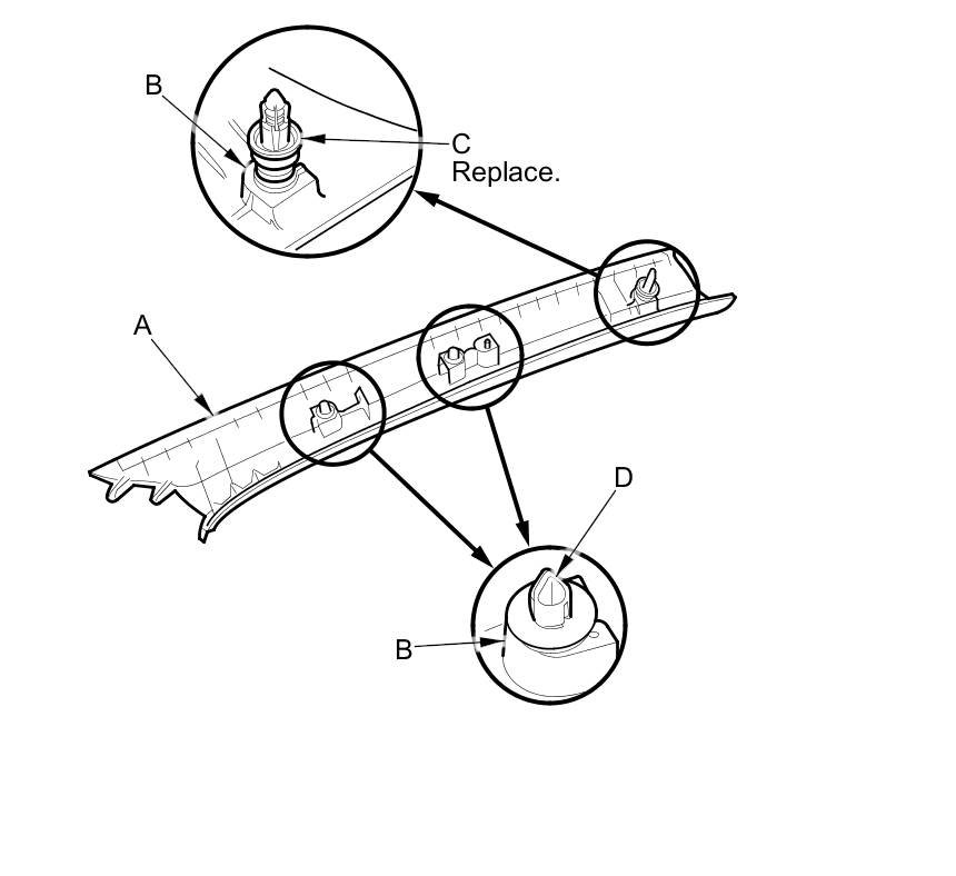 - If the side curtain airbag has deployed, replace the B-pillar upper trim (A), the B-pillar lower trim (B), and the clip (C) on the trim with new parts Service and Repair.
