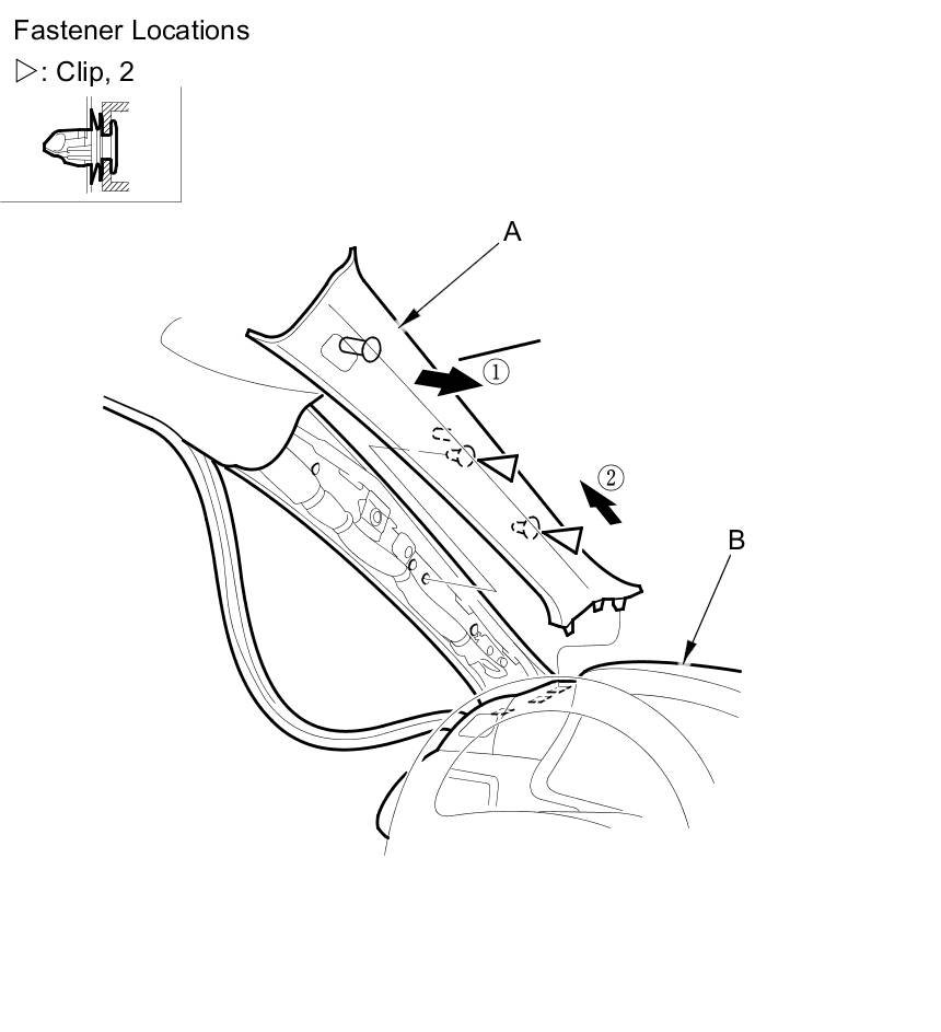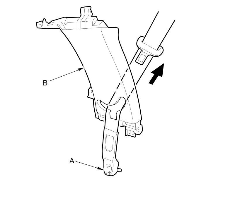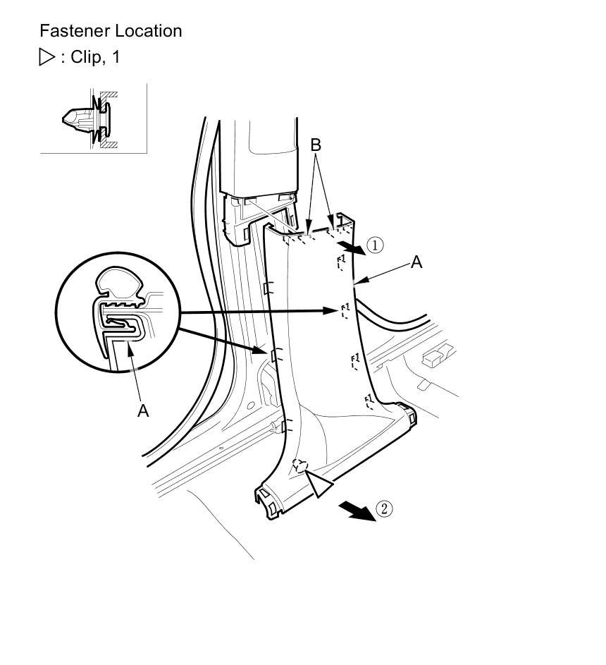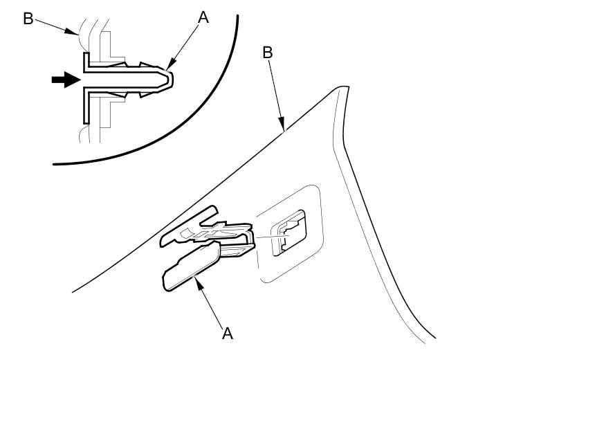 - If the side curtain airbag has deployed, replace the B-pillar upper trim (A) and all clips (B) on the trim with new parts Service and Repair.