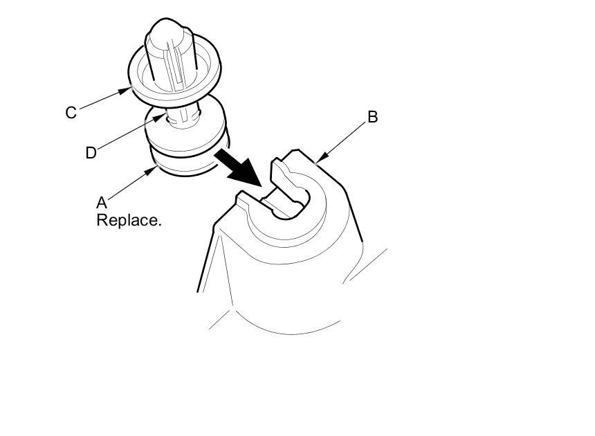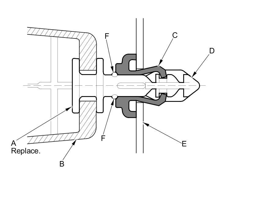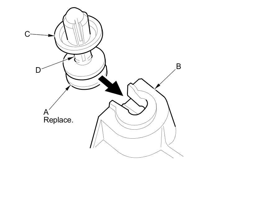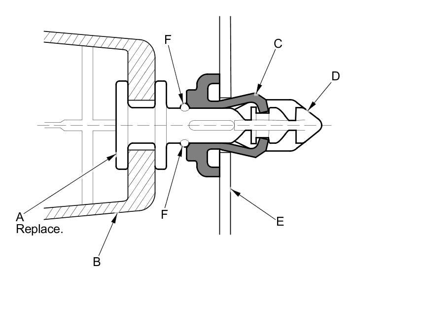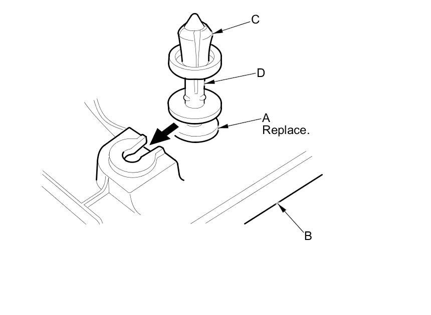- The rear clip (A) in the C-pillar trim (B) consists of a plastic grommet (C) and a metal pin (D). The grommet expanded by the pin secures it to the body panel (E). The projections (F) on the pin break during removal, so the rear clip must be replaced with a new one when the trim is reinstalled.