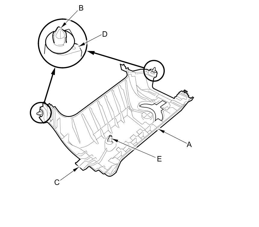 - Make sure the pin (E) on the B-pillar upper trim is engaged to the hole in the body when installing the trim.