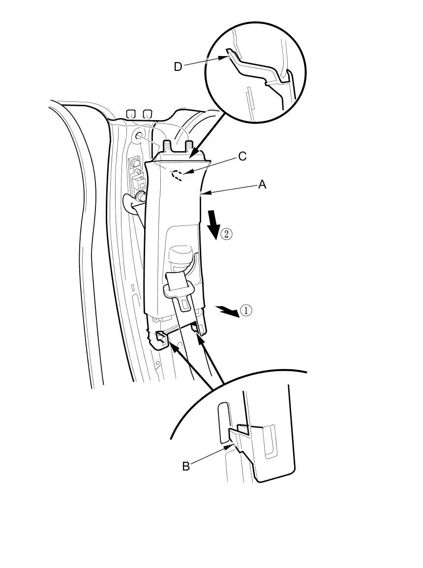 5. Pull down the front edge of the C-pillar trim (A) from the B-pillar upper trim (B) by detaching the hooks (C), and pull down the roof area of the C-pillar trim by detaching the clips and releasing the projection (D).