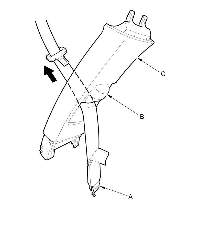 6. Pass the front seat belt lower anchor (A) out through a hole in the slider (B), then remove the B-pillar upper trim (C).