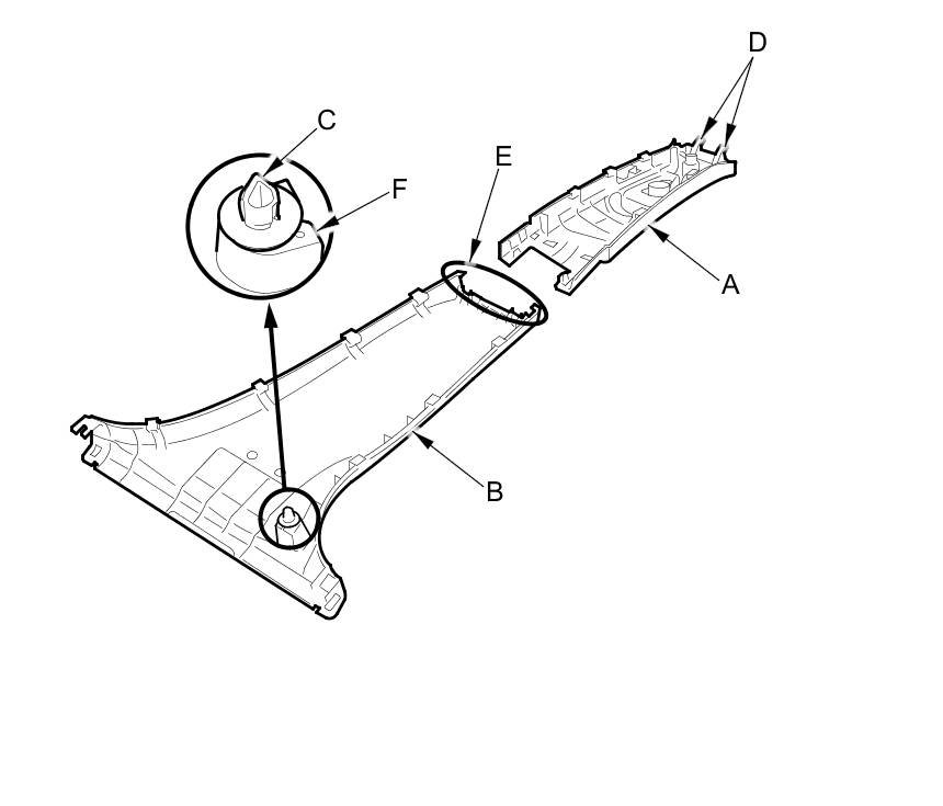 - The upper clip (A) in the A-pillar trim (B) consists of a plastic grommet (C) and a metal pin (D). The grommet expanded by the pin secures it to the body panel (E). The projections (F) on the pin break during removal, so the upper clip must be replaced with a new one when the trim is reinstalled.