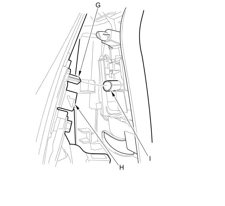 - Make sure the pin (G) on the front seat belt shoulder anchor adjuster (H) and the hole (I) on the back of the slider are engaged when installing the B-pillar upper trim.