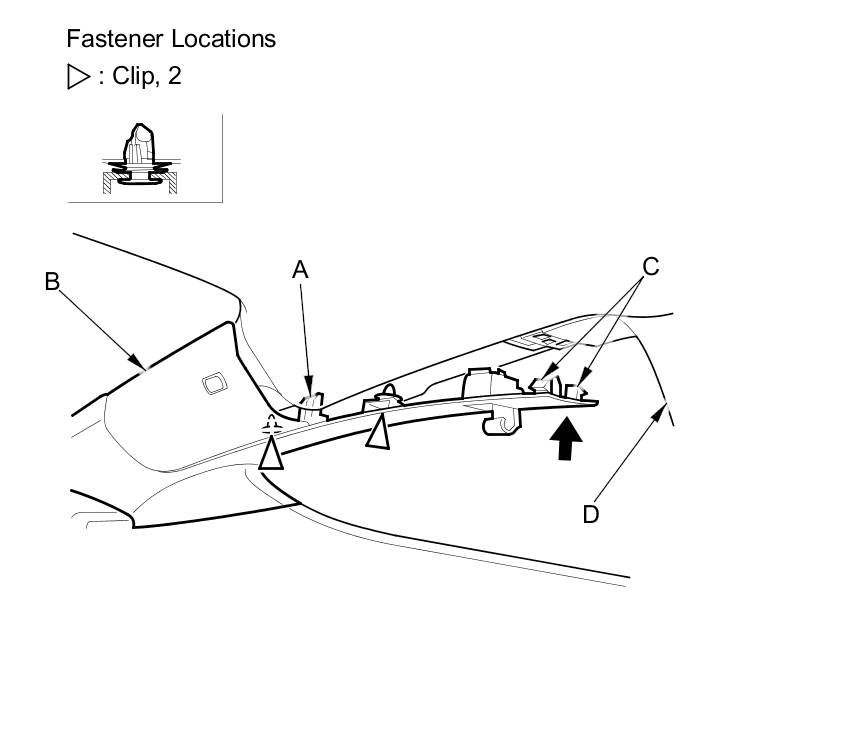 9. Carefully install the new upper clip (A) to the C-pillar trim (B). Be sure that the grommet (C) is nearest to the top of the pin (D) as shown.