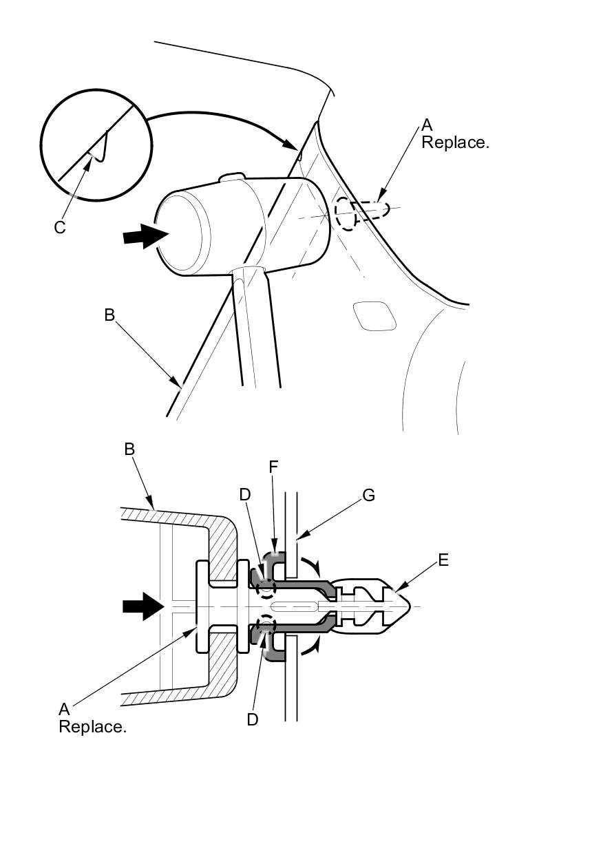 3. Hit the upper clip (A) in the C-pillar trim (B) with a rubber mallet. The clip is located under the point where the mark (C) on the edge of the trim indicates. Hitting the clip breaks the projections (D) on the pin (E) and pushes it into the grommet (F) on the body (G).