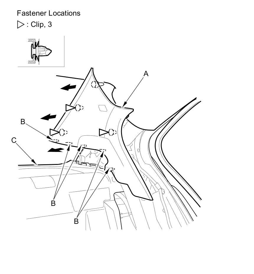 - After checking and adjusting the overlap between the headliner and the C-pillar trim, replace the upper clip (C) with a new one.