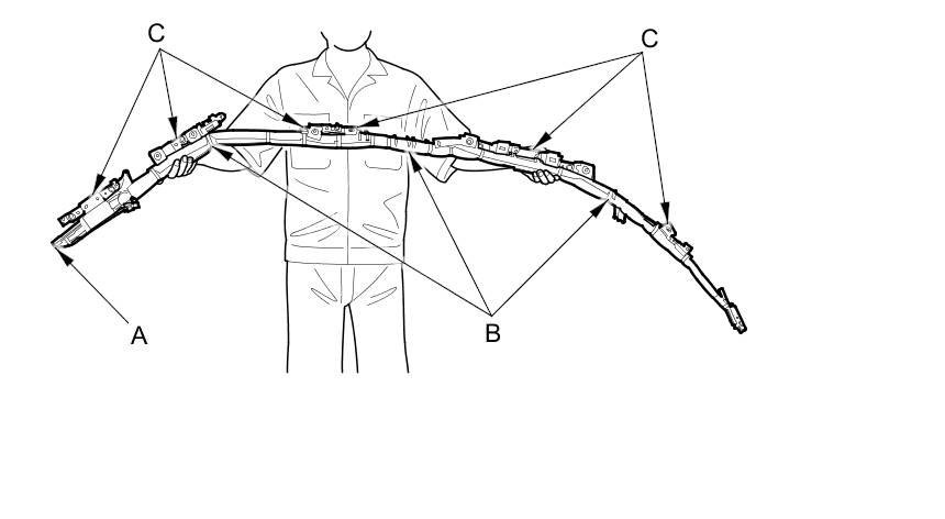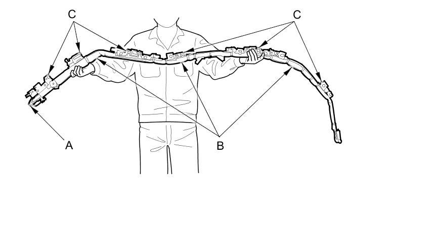 - The side curtain airbag module assembly is a long, jointed part containing an inflator (A), a flexible bag (B), and brackets (C). When removing or installing the side curtain airbag assembly, never: