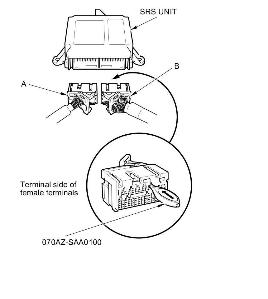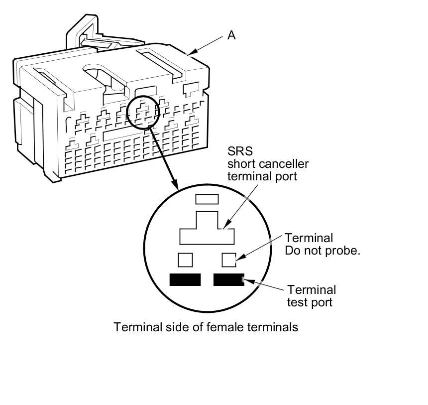 When diagnosing or troubleshooting at an SRS unit connector (A), use the terminal test port below the terminal you need to check. Gently insert the pin probes of the tester or jumper wire at the terminal test port from the terminal side.