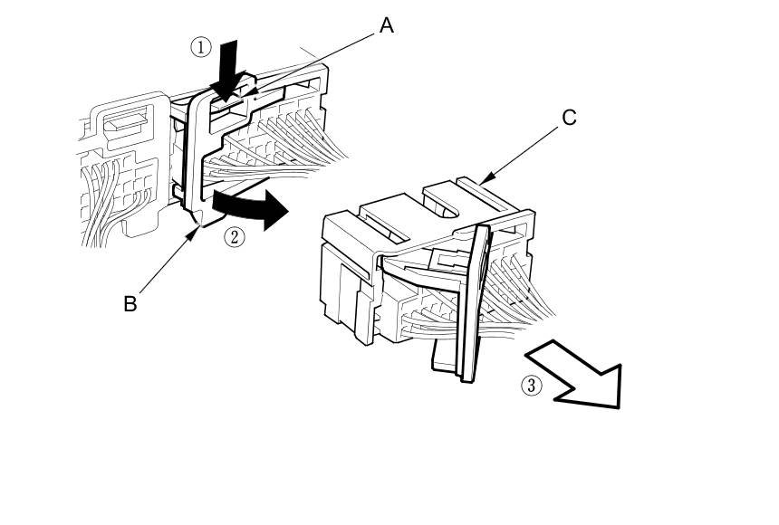 To release the lock (A), pull the lever (B) while pushing the lock on the outside of the connector, then pull out the connector (C).
