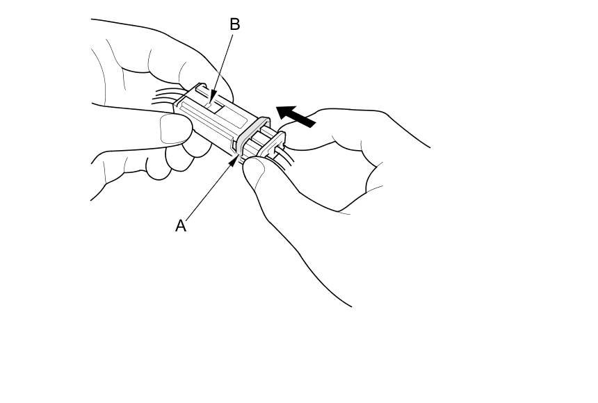 To reconnect, hold the pawl-side connector, and press on the back of the sleeve-side connector in the direction shown. As the two connector halves are pressed together, the sleeve (A) is pushed back by the pawl (B). Do not touch the sleeve.