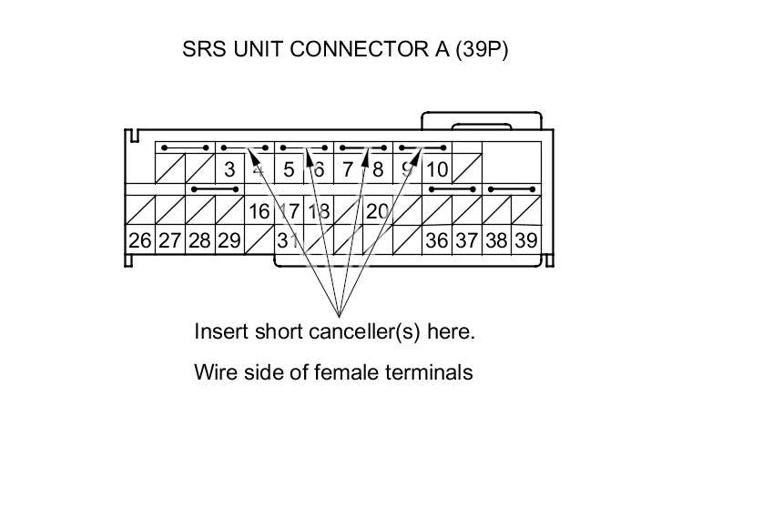 Terminal numbers are shown from the wire side of the female terminals. Insert the SRS short canceller(s) into the cavities on the terminal side of the connector.