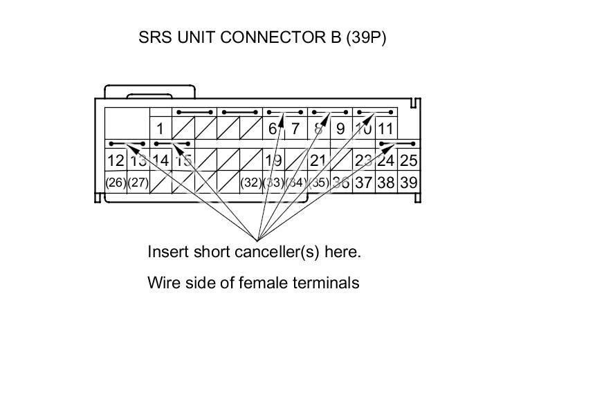 When SRS unit connector A (39P) and B (39P) are disconnected, short circuits are automatically created in the connector to prevent accidental deployment of an airbag or tensioner. The circuit may need to be opened sometimes when diagnosing the system. Insert an SRS short canceller in the specified cavities when necessary to keep the circuit open for diagnosis.