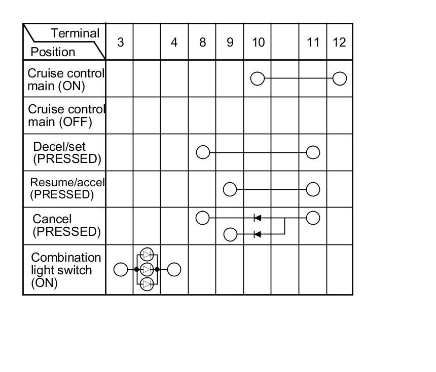 - If there is continuity, and it matches the table, but the cruise control combination switch failure occurred on the cruise control input test, check and repair the wire harness on the switch circuit.
