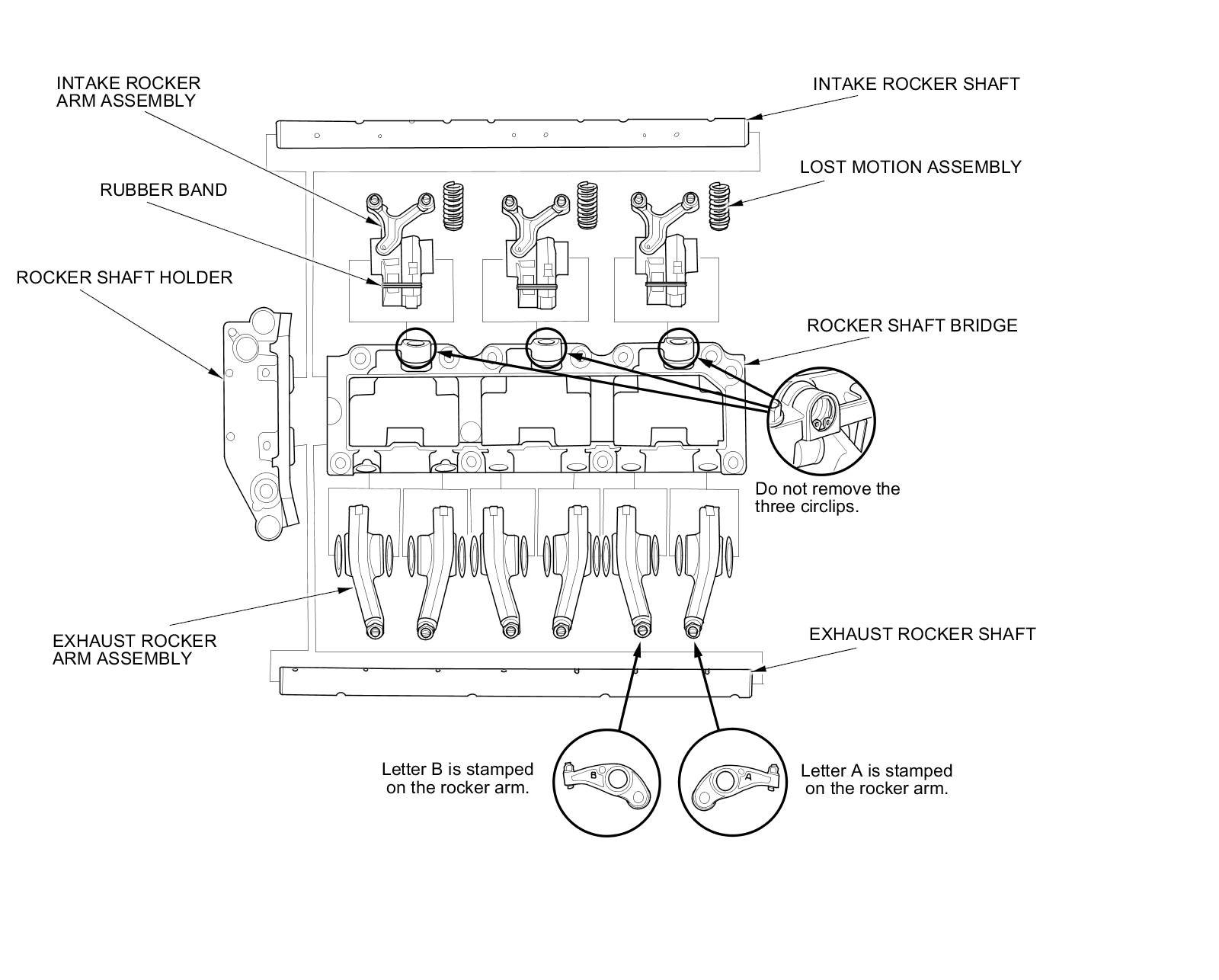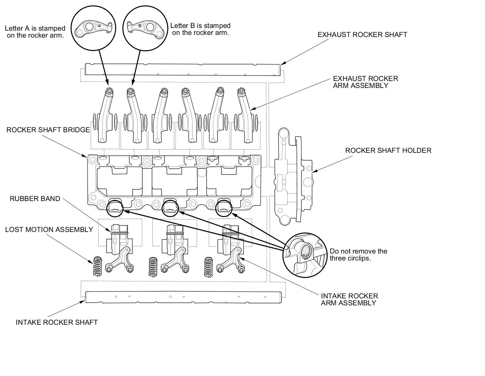 - Never remove any of the circlips that retain the lost motion assemblies in the rocker shaft bridge. The circlips are not available separately, and are factory installed in the rocker shaft bridge. To remove the lost motion assemblies, first remove the rocker shafts and the rocker arms.
