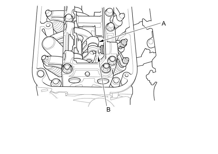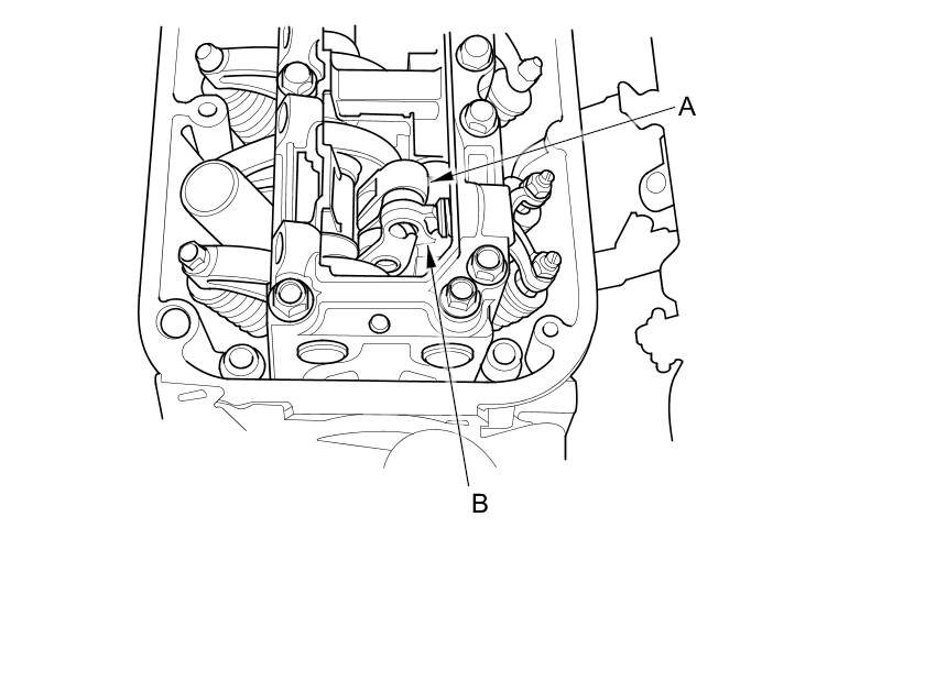 3. Rotate the crankshaft pulley clockwise. Make sure that the intake primary rocker arm (A) and the intake secondary rocker arm (B) are separated and that the intake primary rocker arm should move independently: