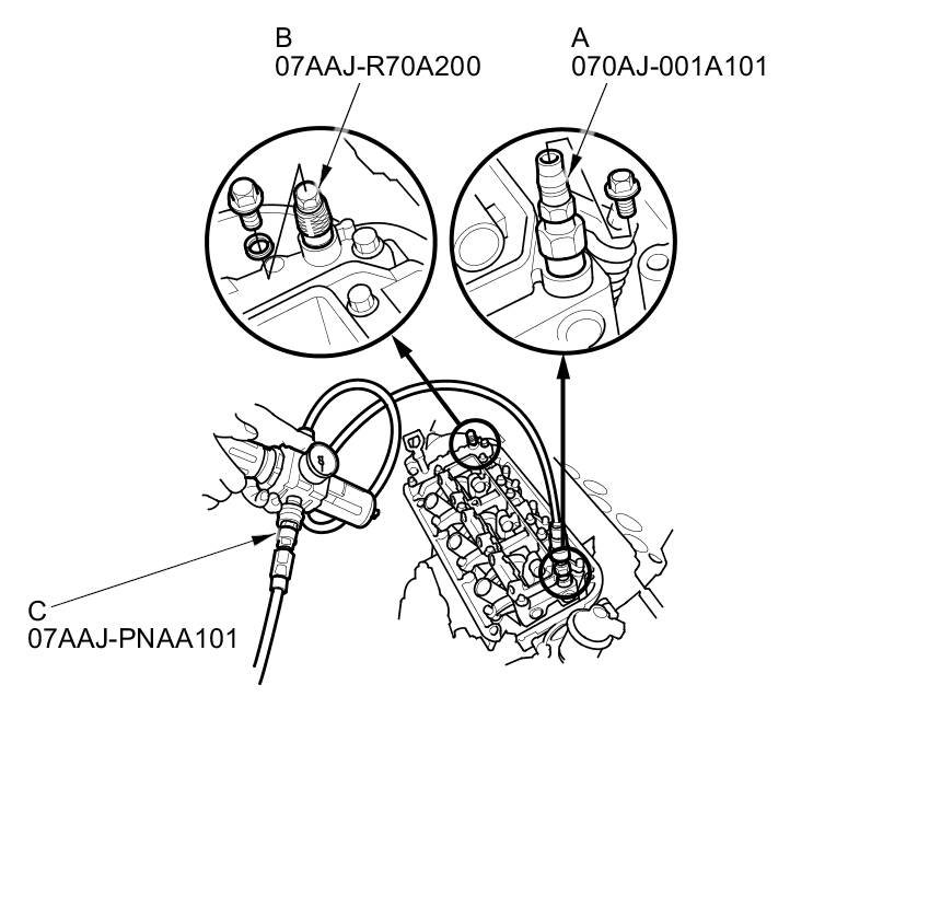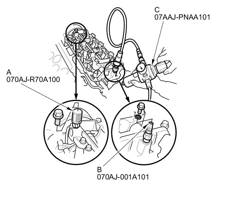 7. Remove the sealing bolts, then install VTEC air stop tool A and the VCM air adapter (B) to the inspection hole, then connect the air pressure regulator (C) as shown.