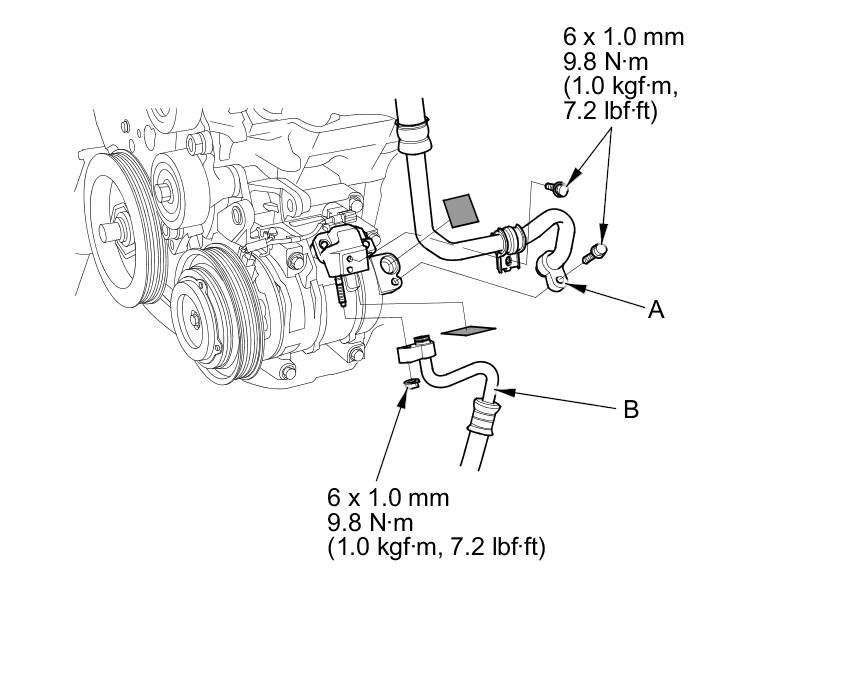 5. Remove the bolts and the nut, then disconnect the suction hose (A) and the discharge hose (B) from the A/C compressor. Plug or cap the lines immediately after disconnecting them to avoid moisture and dust contamination.