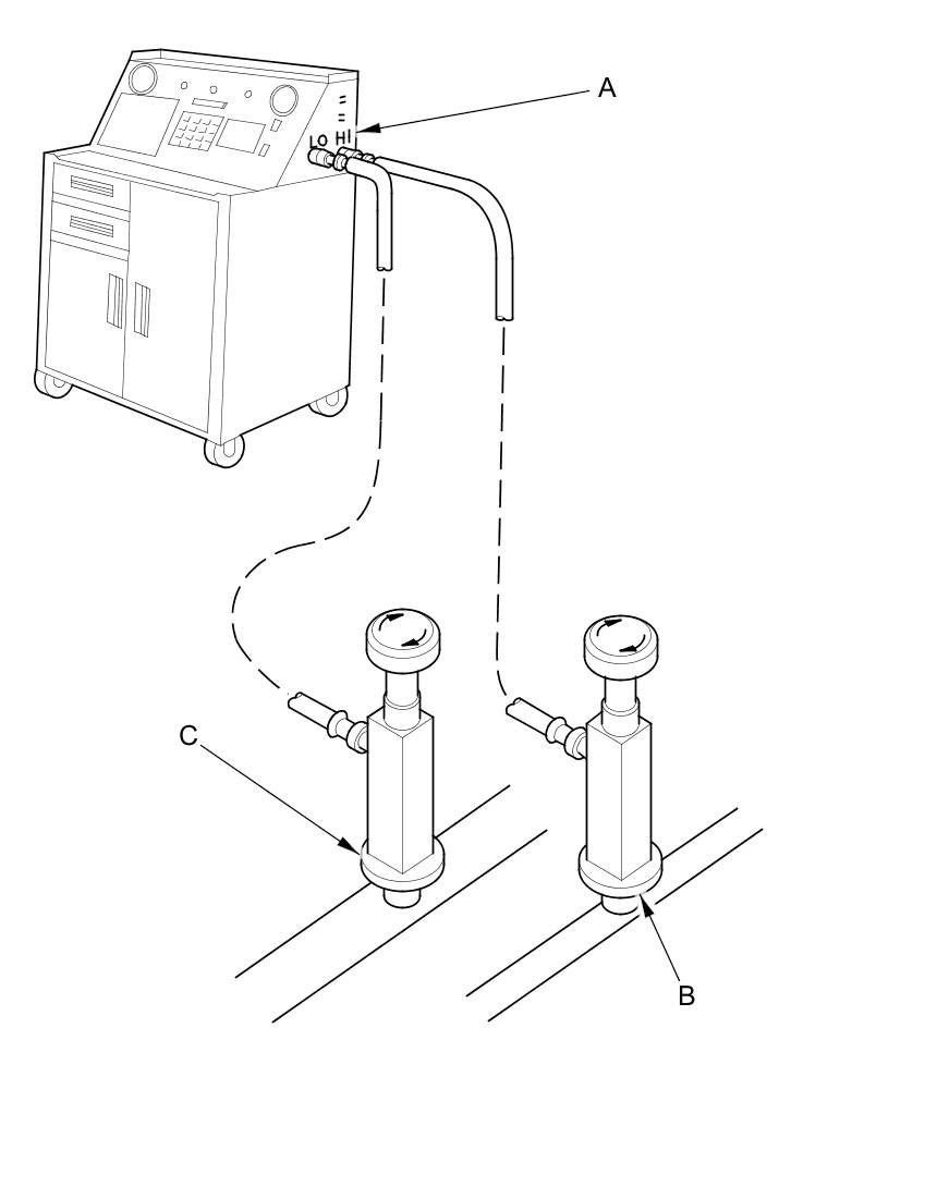 1. Connect an R-134a refrigerant recovery/recycling/charging station (A) to the high-pressure service port (B) and the low-pressure service port (C), as shown, following the equipment manufacturer's instructions.