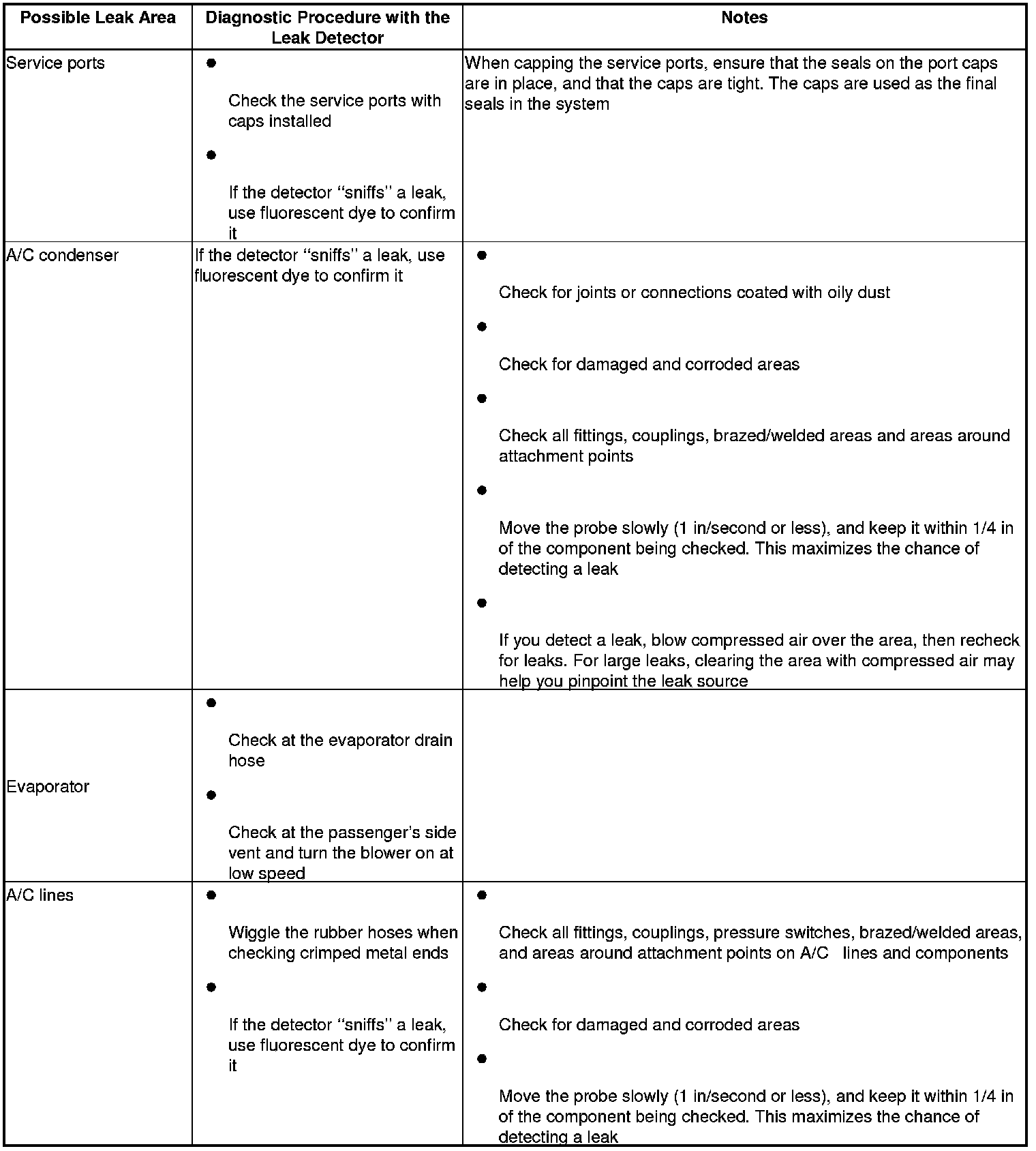 - R-134a is heavier than air; always check below and to the sides of all potential leak sources.