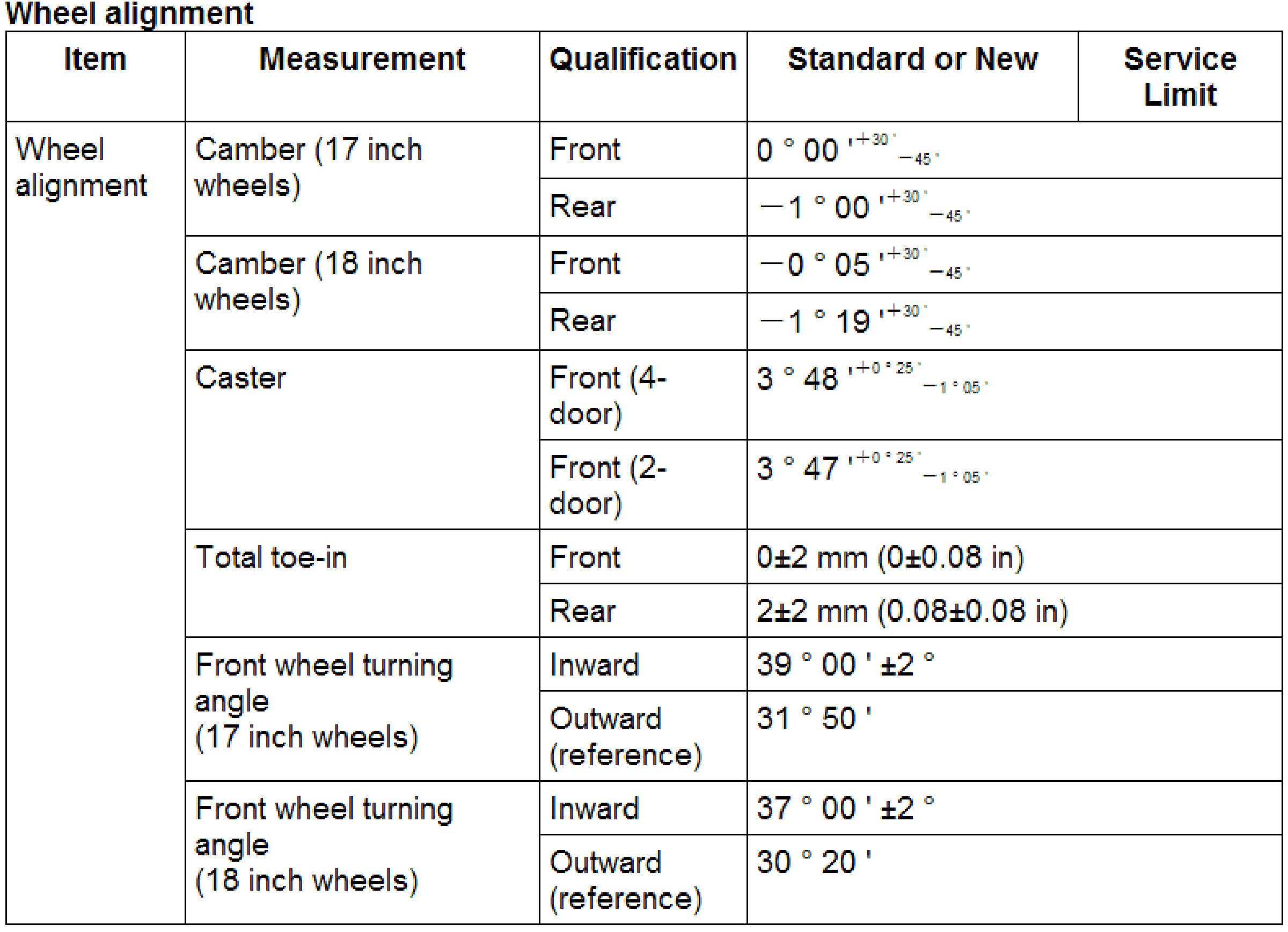 Wheel Alignment Specifications