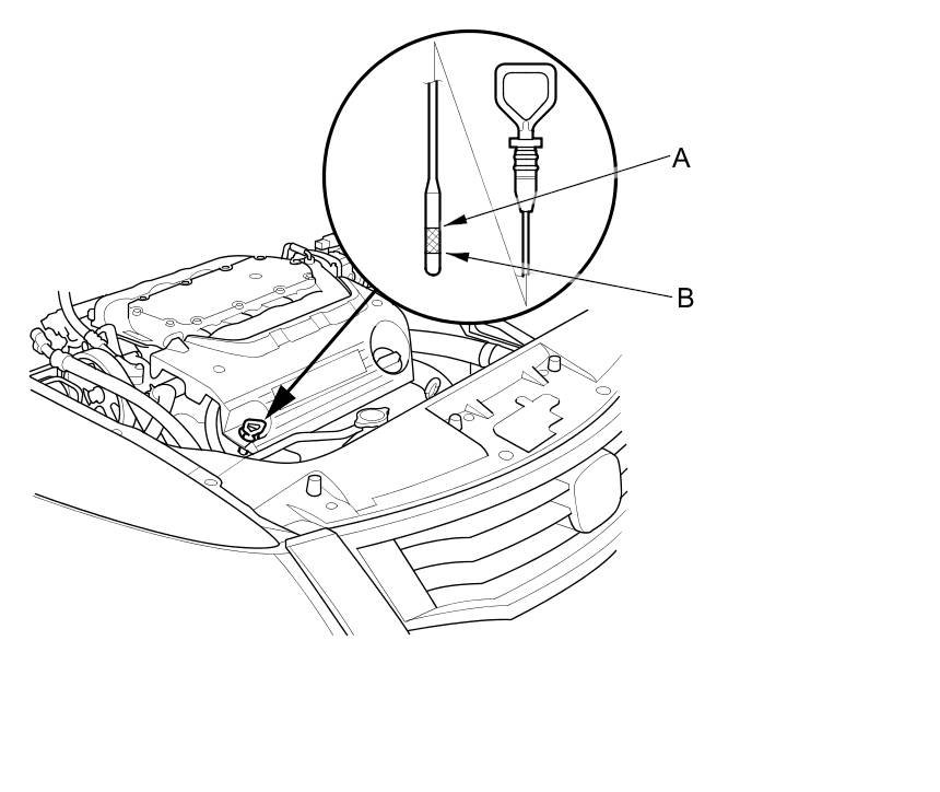 3. Remove the dipstick, and check the engine oil level. It should be between the upper mark (A) and the lower mark (B).