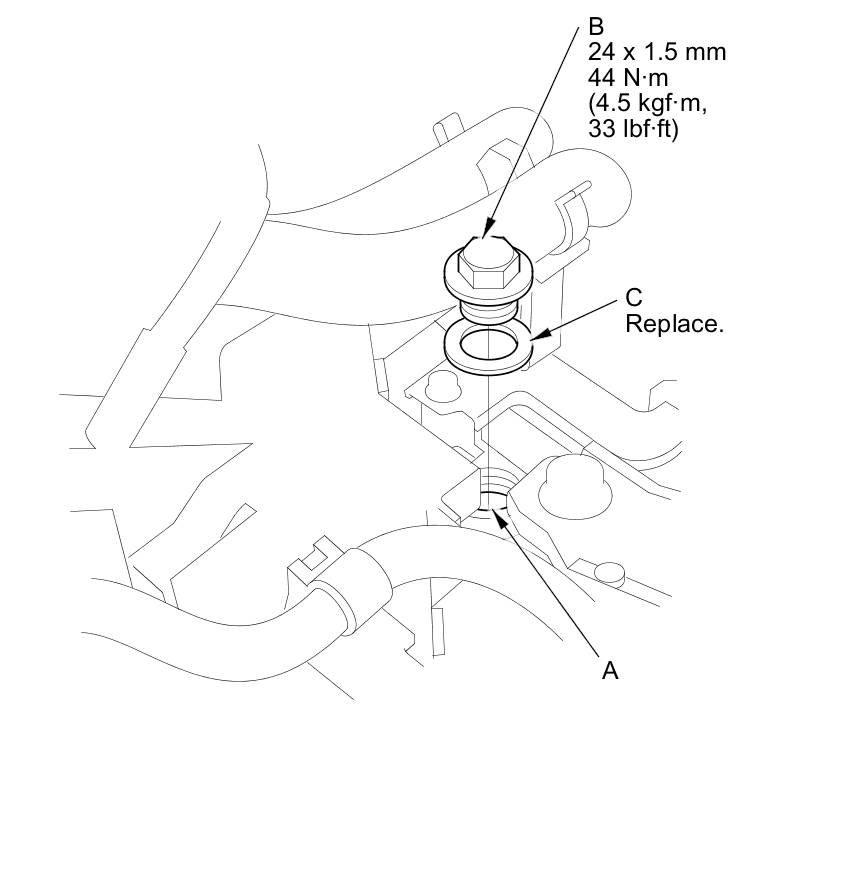 9. Install the ATF filler bolt (B) with a new sealing washer (C).