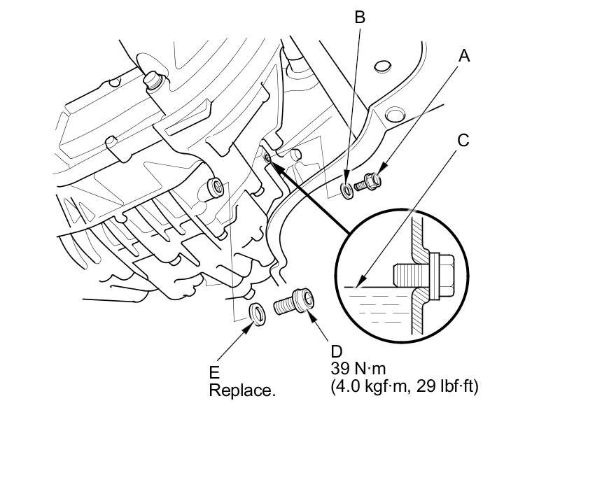 4. If the fluid is dirty, remove the drain plug (D) and the sealing washer (E), and drain the MTF.