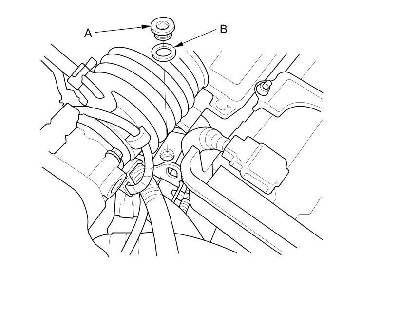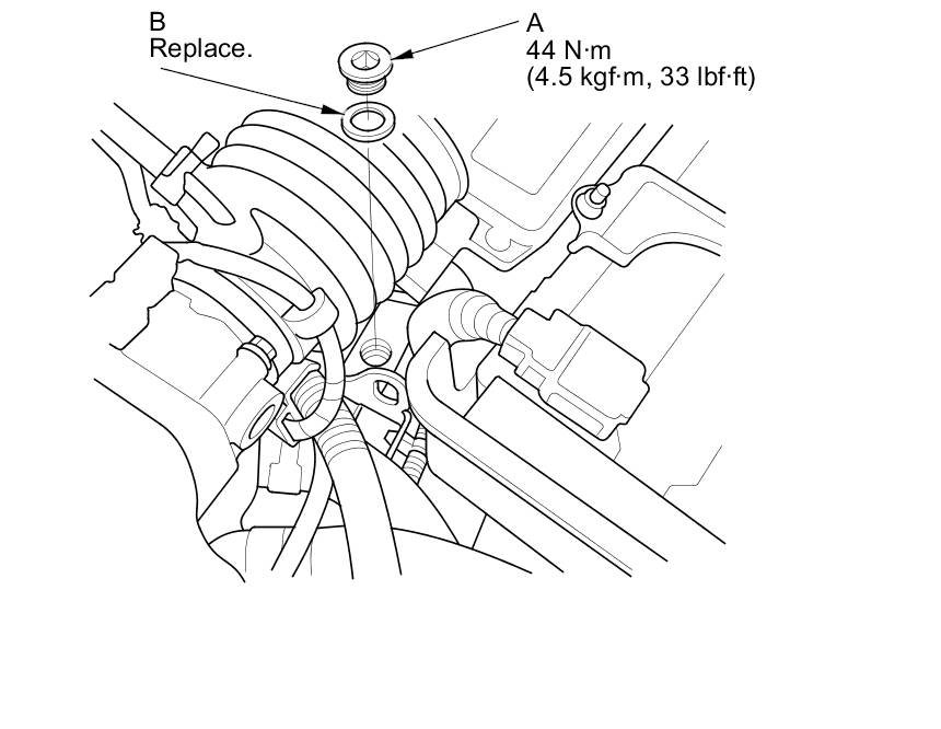6. Lower the vehicle, then remove the filler plug (A) and the sealing washer (B).