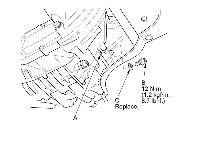 3. Remove the oil check bolt (A) and the sealing washer (B). Check the condition of the MTF and make sure it is at the proper level (C).