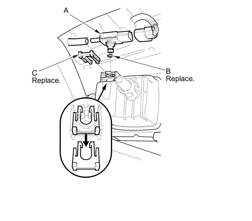 4. Install the parts in the reverse order of removal with a new O-ring (B) and a new retainer (C).