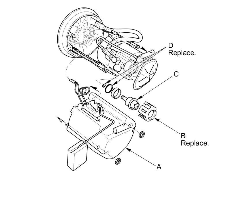 5. Install the parts in the reverse order of removal with new O-rings (D) and a new bracket. When installing the fuel tank unit, align the marks on the unit and the fuel tank.