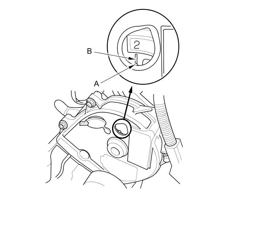 9. Rotate the crankshaft clockwise. Align the pointer (A) on the front upper cover with the No. 2 piston TDC mark (B) on the front camshaft pulley.