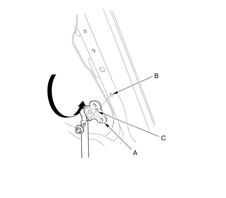 1. Remove the hood support strut bracket (A) on both sides of the hood. Rotate the brackets over and reattach them to the wide-open position (B) with a bolt in center hole (C) of the bracket.