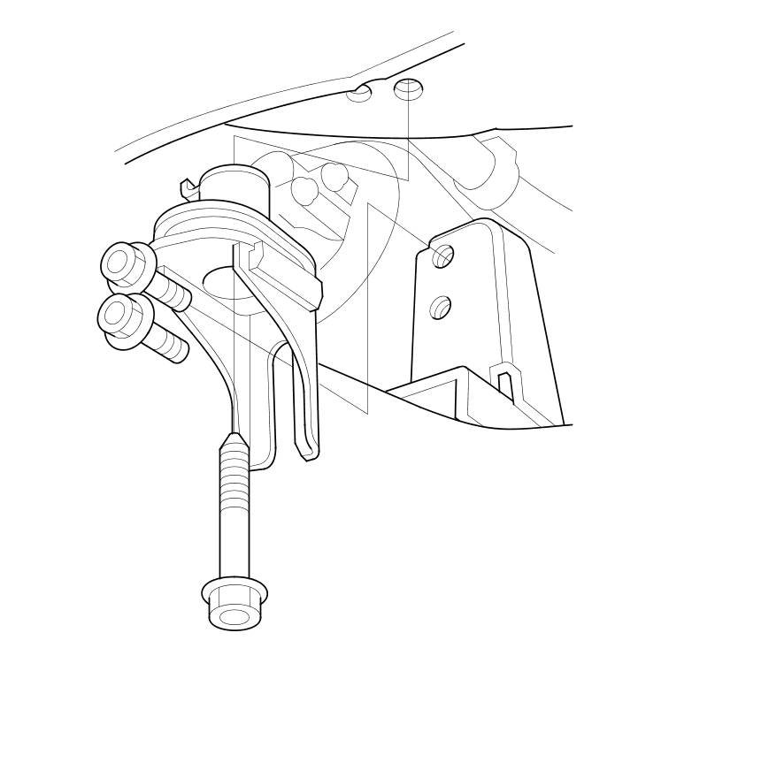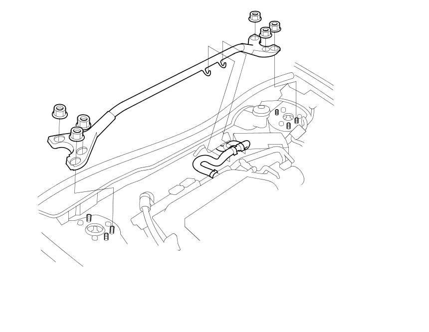 - Be careful not to damage the hood opener cable when installing the engine support hanger at the front bulkhead.