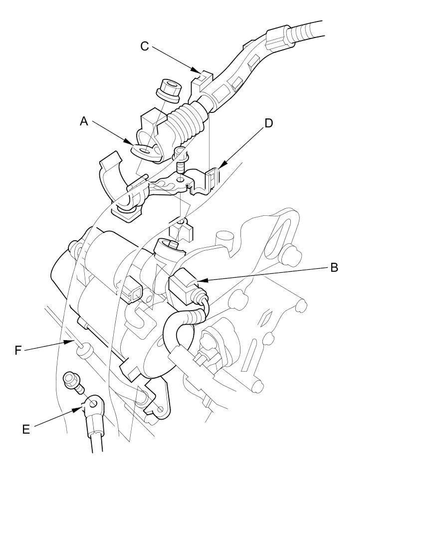 15. Remove the transmission ground cable (E) and the ATF dipstick (F).