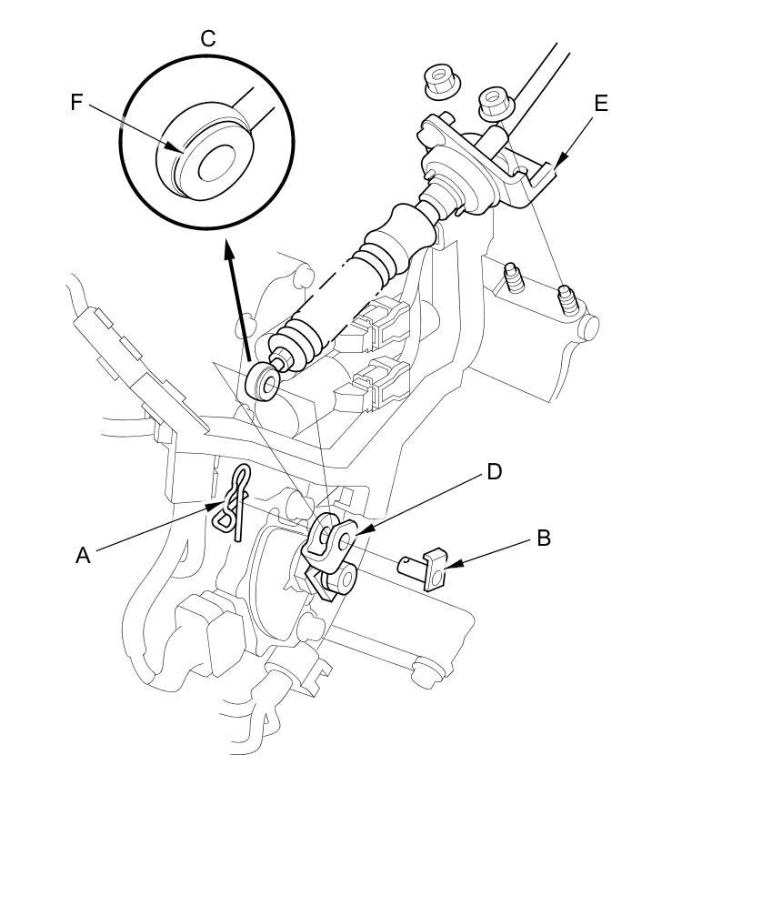 20. Check the bushing (F) in the shift cable end for proper fit and wear. If the bushing is loose or worn, replace the shift cable Service and Repair.