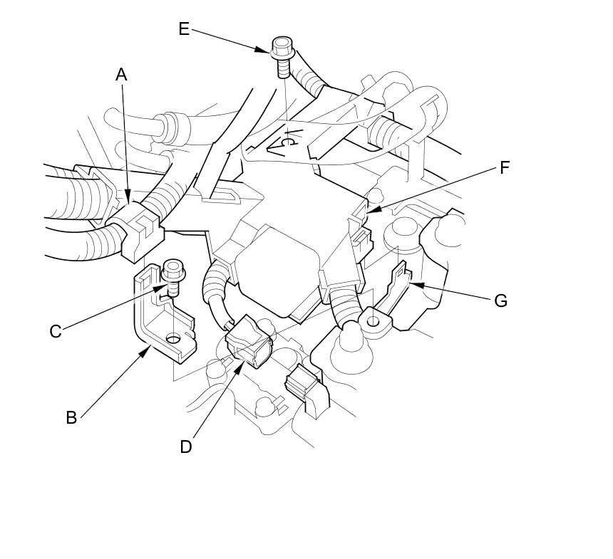 28. Remove the harness cover mounting bolt (E), and remove the harness cover (F) from its bracket (G).