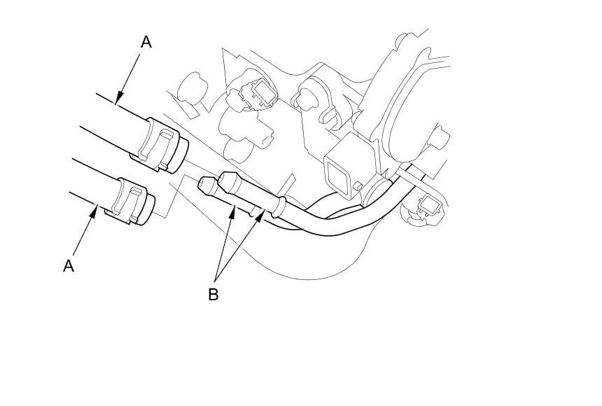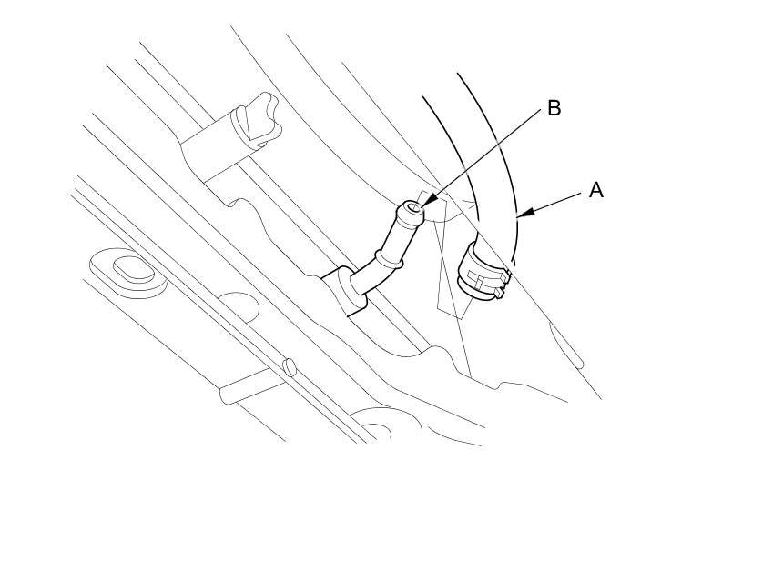 31. Disconnect the ATF cooler hoses (A) from the ATF cooler lines (B). Turn the ends of the cooler hoses up to prevent ATF from flowing out, then plug the hoses and lines.