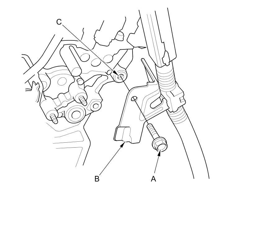 26. Remove the harness clamp (A) from its bracket (B), then remove the bolt (C) securing the harness clamp bracket.