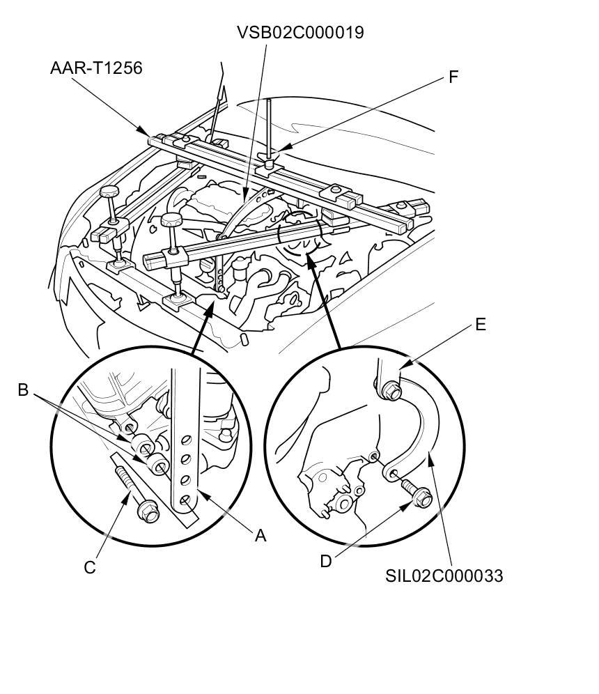 36. Install the engine support hanger (AAR-T1256) onto the vehicle, and attach the hook to the engine balance bar slot. Tighten the wing nut (F) by hand, and lift and support the engine.