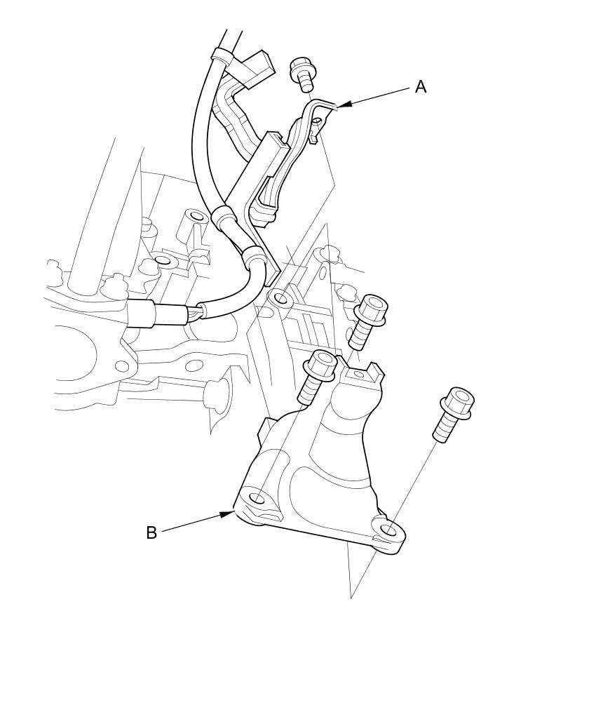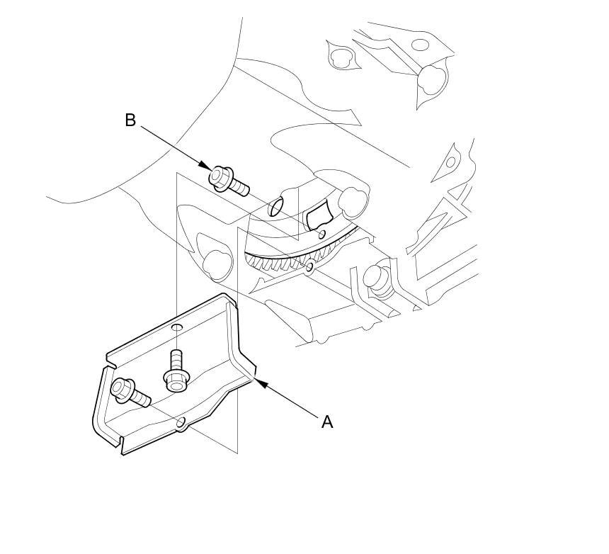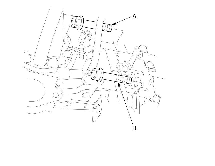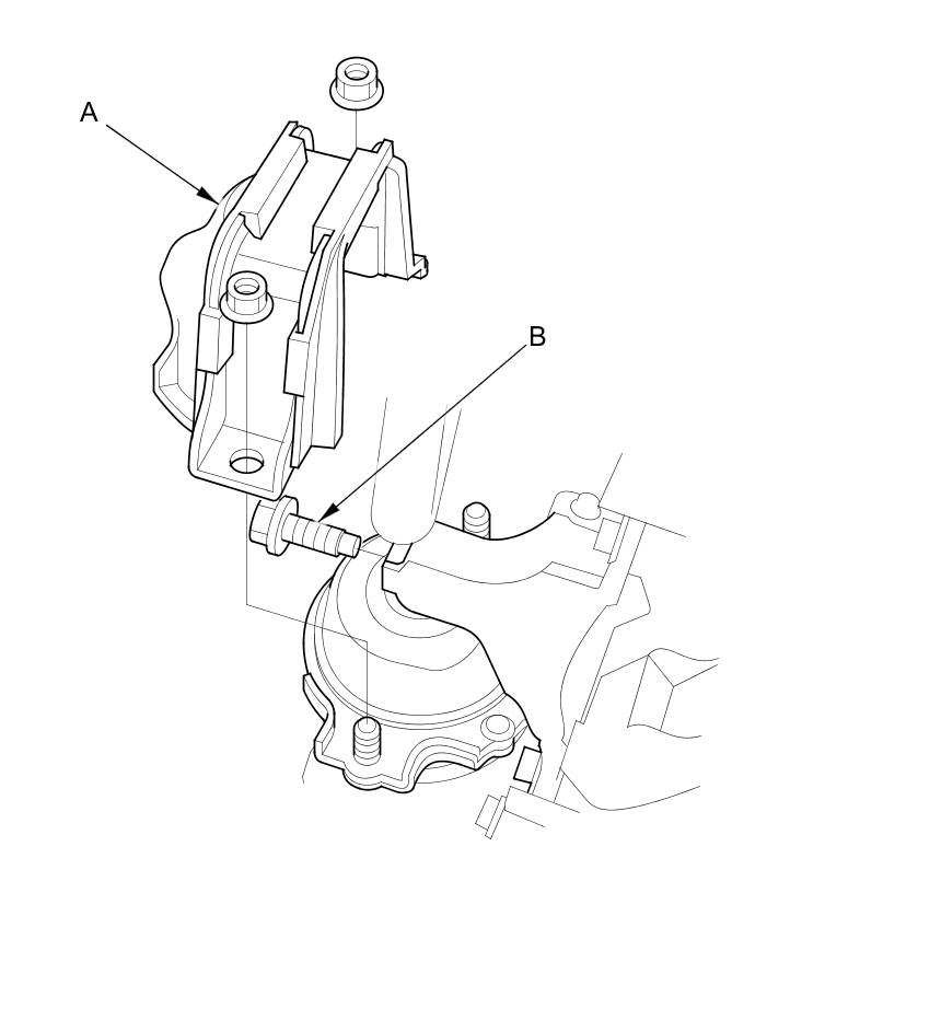 70. Remove the sensor harness clamp bracket (A) from the front engine mount bracket (B), and remove the front engine mount bracket.