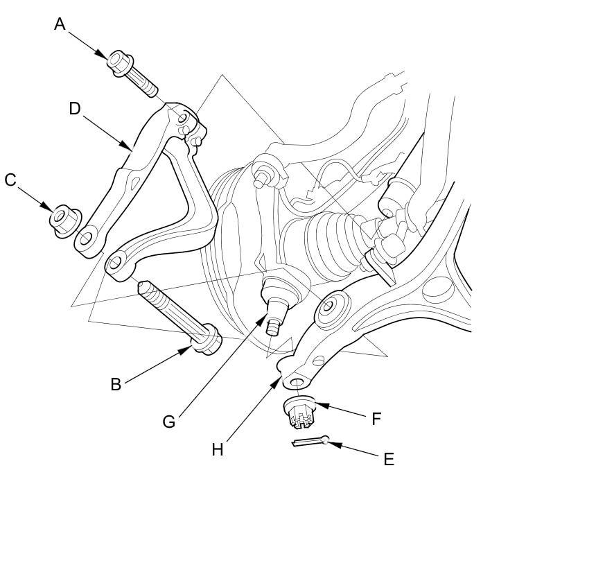 40. Remove the cotter pin (E) and the castle nut (F), and separate the knuckle ball joint (G) from the lower arm (H) on both sides.