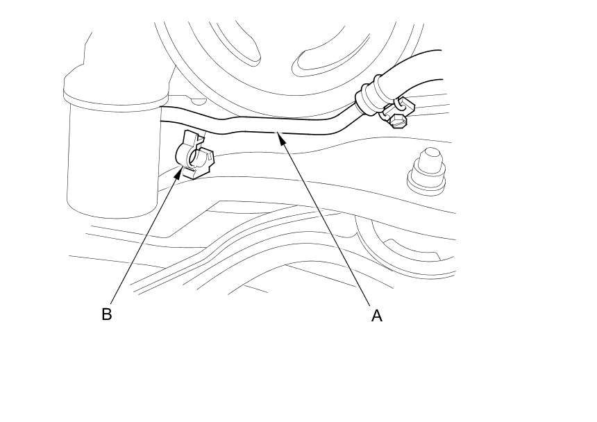 41. Release the power steering fluid line (A) from its clamp (B) at the right front of the subframe.