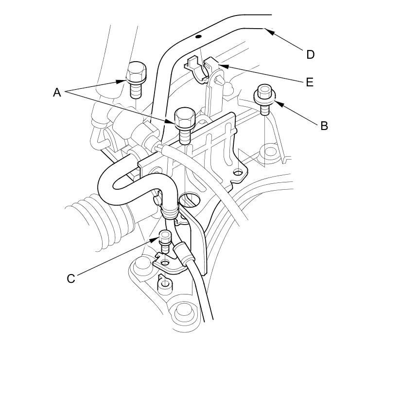 46. Remove the bolt (E) securing the power steering fluid line clamp.