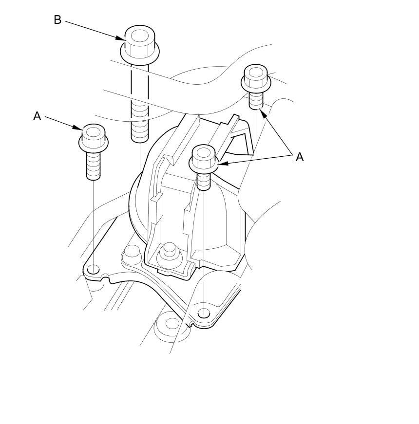 47. Remove the rear engine mount base bracket bolts: 10 x 1.25 mm (A) (three bolts) and 12 x 1.25 mm (B).