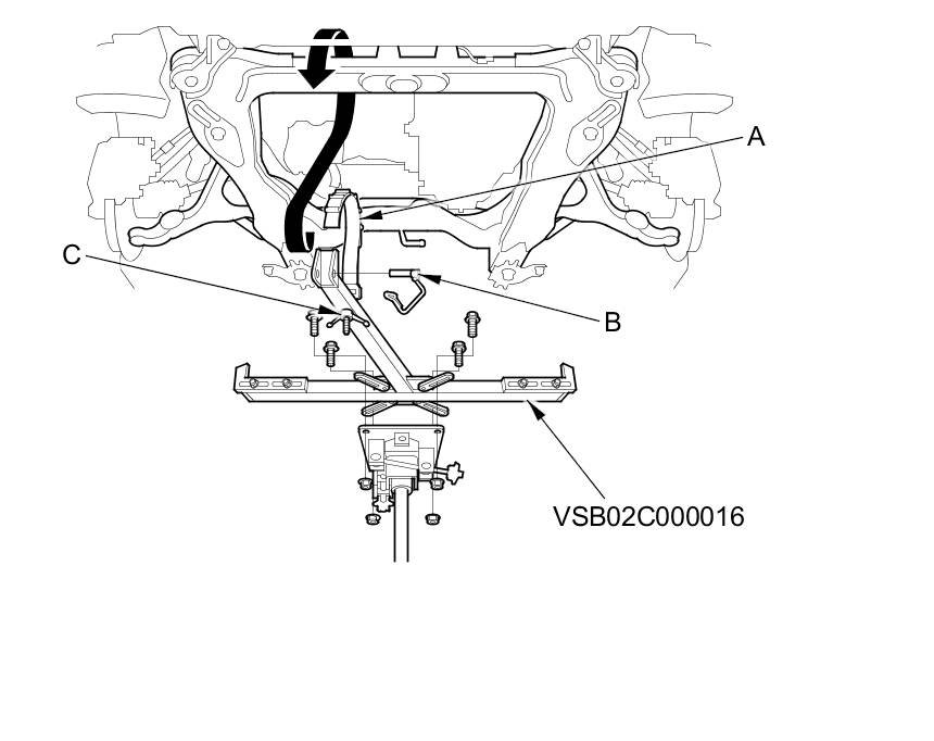 53. Set the subframe adapter (VSB02C000016) to the front subframe by looping the strap (A) over the front of the front subframe, then secure the strap with the stop (B), then tighten the wing nut (C).