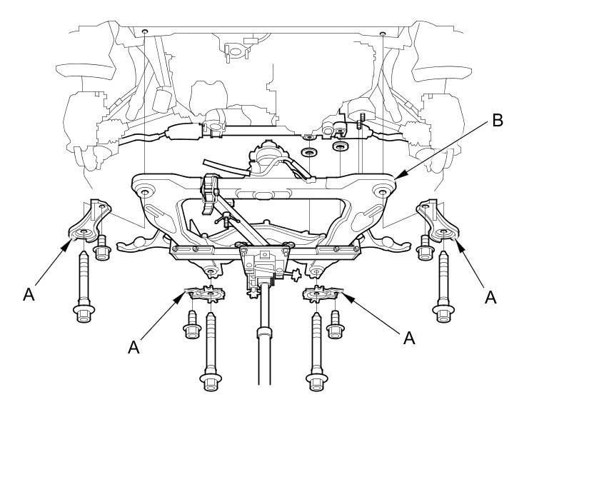 56. Remove the four bolts securing the stiffeners (A) and the four bolts securing the front subframe (B), and lower the front subframe.